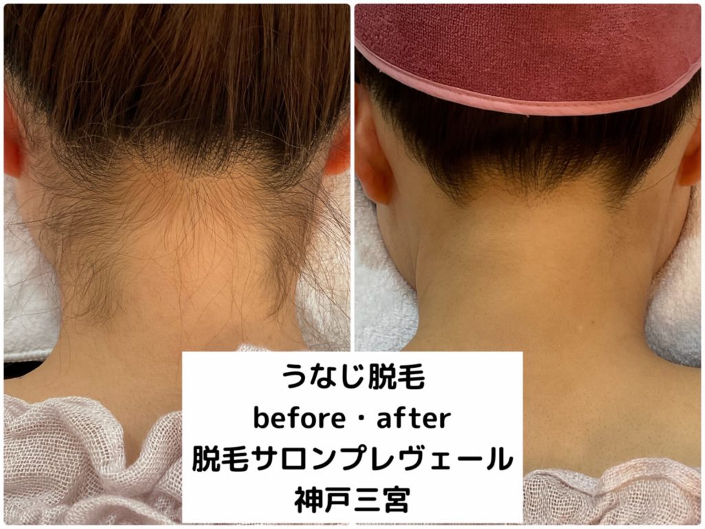 写真のビフォーアフターをご覧いただくと、産毛やムダ毛がなくなるだけでなく、首筋がすっきりして首が長く見える印象になっているのがわかります。