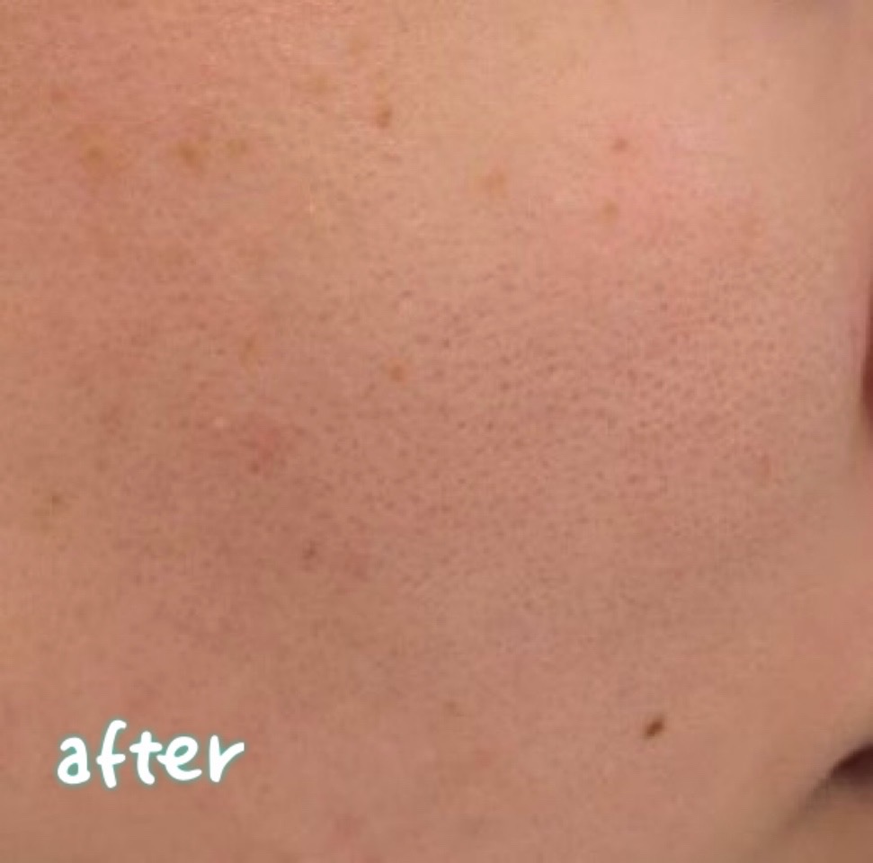 Afterの画像:毛穴の角栓がクリアになり、肌全体が落ち着いて、明るいトーンになっています。ニキビ跡の色素沈着も薄くなり、色ムラも少なくなりました。