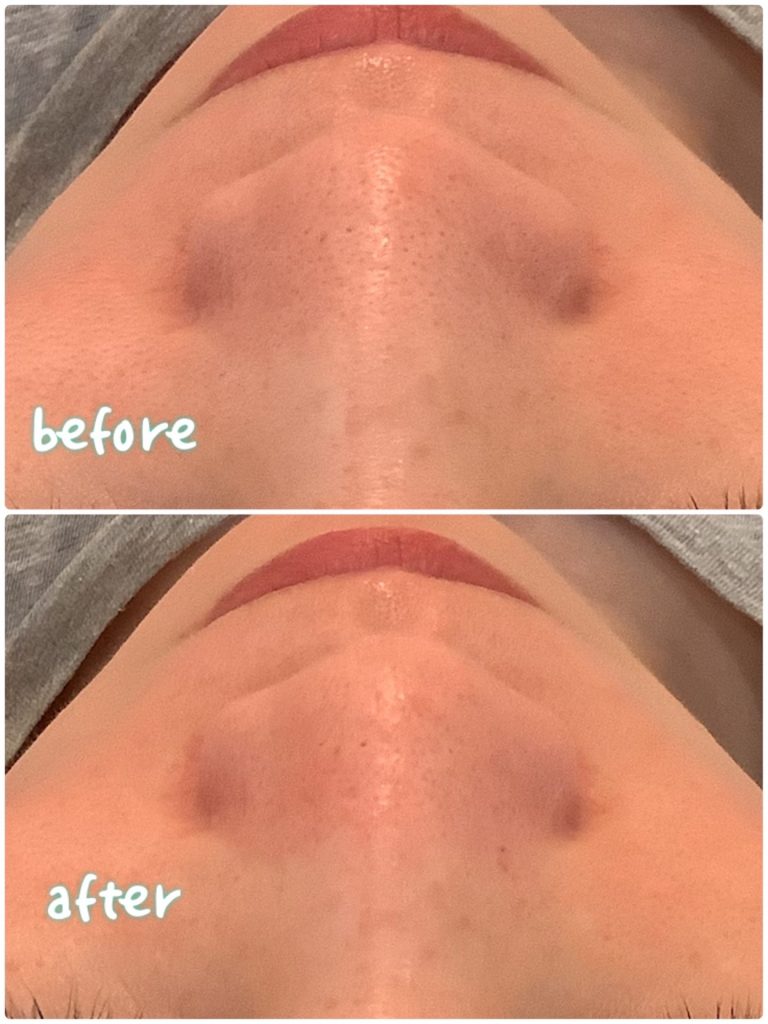 こちらの写真をご覧ください。上が「毛穴洗浄前」、下が「毛穴洗浄後」の状態です。Beforeの写真では、毛穴に汚れが詰まっているのがわかりますが、Afterの写真では毛穴の汚れが取り除かれ、綺麗になっています♪