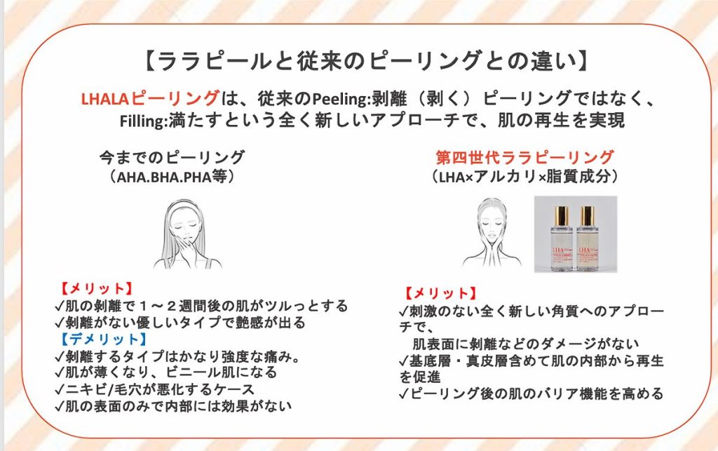 ララピールは、従来のピーリングとは違い、表面的な角質を剥がすのではなく、お肌の奥にまでアプローチし、細胞の再生を促進します。これにより、お肌がふっくらと柔らかくなり、内側から輝くような透明感が得られます。さらに、保湿成分もたっぷり含まれているため、ピーリング後も乾燥を感じることなく、しっとりとしたお肌を実感できます。